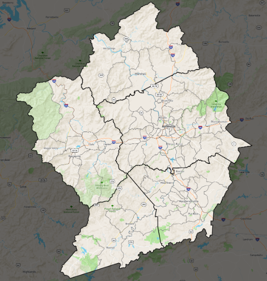 The study area is located in Western North Carolina and includes Madison, Buncombe, Haywood, Henderson, and Transylvania Counties.
